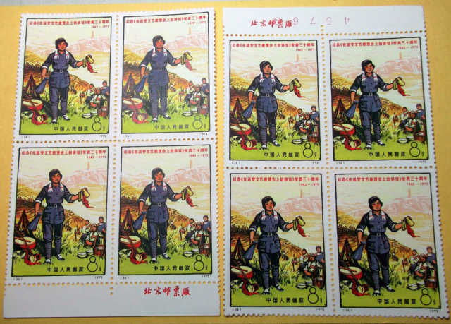 N33, N35, N36, N38 PR China Stamp Culture Revolution N33-38 Yanan Forum Talks 2 Blocks of Four of N36 with edges, plus 4 old used stamps; 12 stamps in total. 编号邮票33-38 纪念《在延安文艺座谈会上的讲话》发表三十周年 新票8枚 2四方連