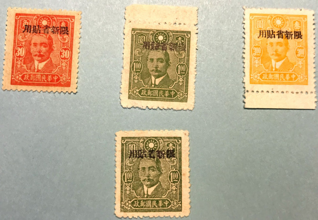 Republic of China (ROC) Post Stamps Limited to Local Use: Chuan.Ord.2 1st London Print Dr.Sun Yat-Sen Issue Overprinted with “Restricted for Use in Sichuan; JH.Ord.1 2nd Beijing Print Junk Issue Overprinted with “Restricted for Use in Jilin and Heilongjiang”; Xin.C.4 Unification of National Government Issue Overprinted with “for Use in Xinjiang"; Xin.Ord.10 Central Trust Print Dr.Sun Yat-sen Issue Overprinted with “Restricted for Use in; old and 6 mint stamps in total.